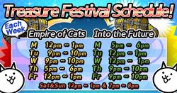 This event only appears in the Main ChaSometimes during a big celebration event like CAT DAY Treasure Festival will be on to celebrate the event. Empire of Cats on even days Into the Future on odd days.